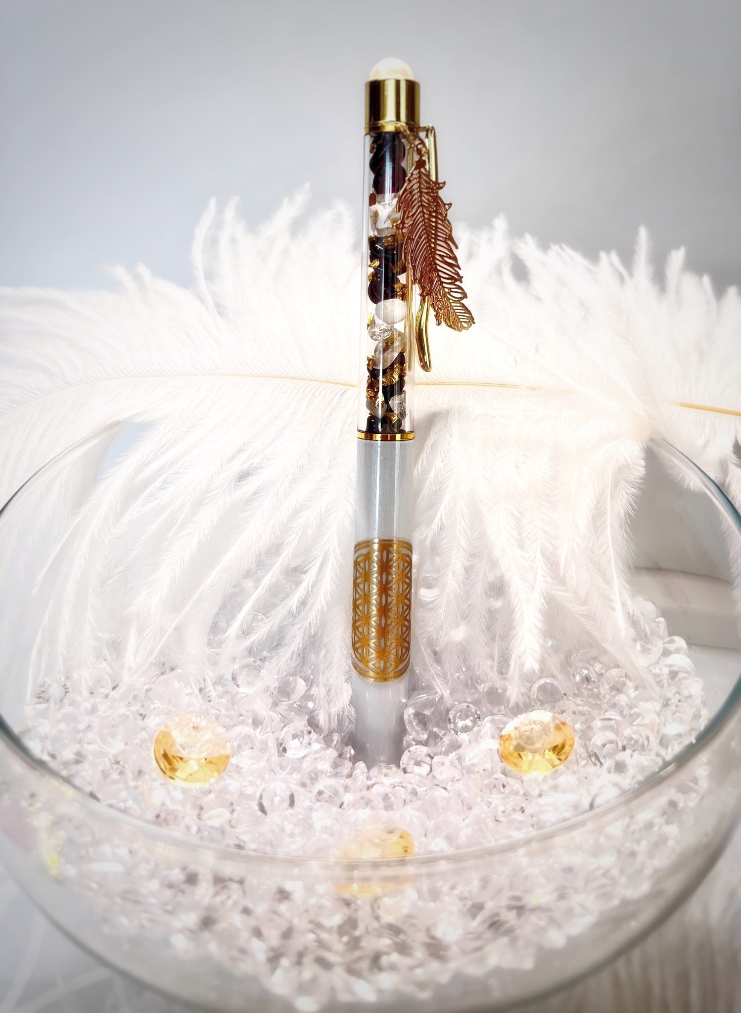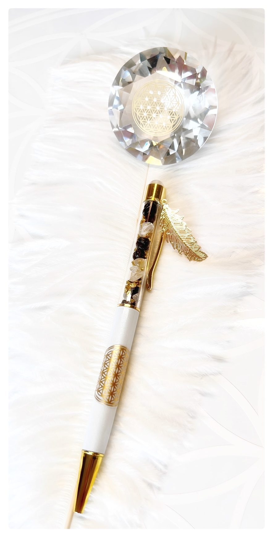 Den Stift regelmäßig energetisch reinigen – z. B. im Mondlicht, im Gebet, mit Klangschalen oder mit Edelsteinen – um seine lichtvolle Schwingung zu erhalten.
