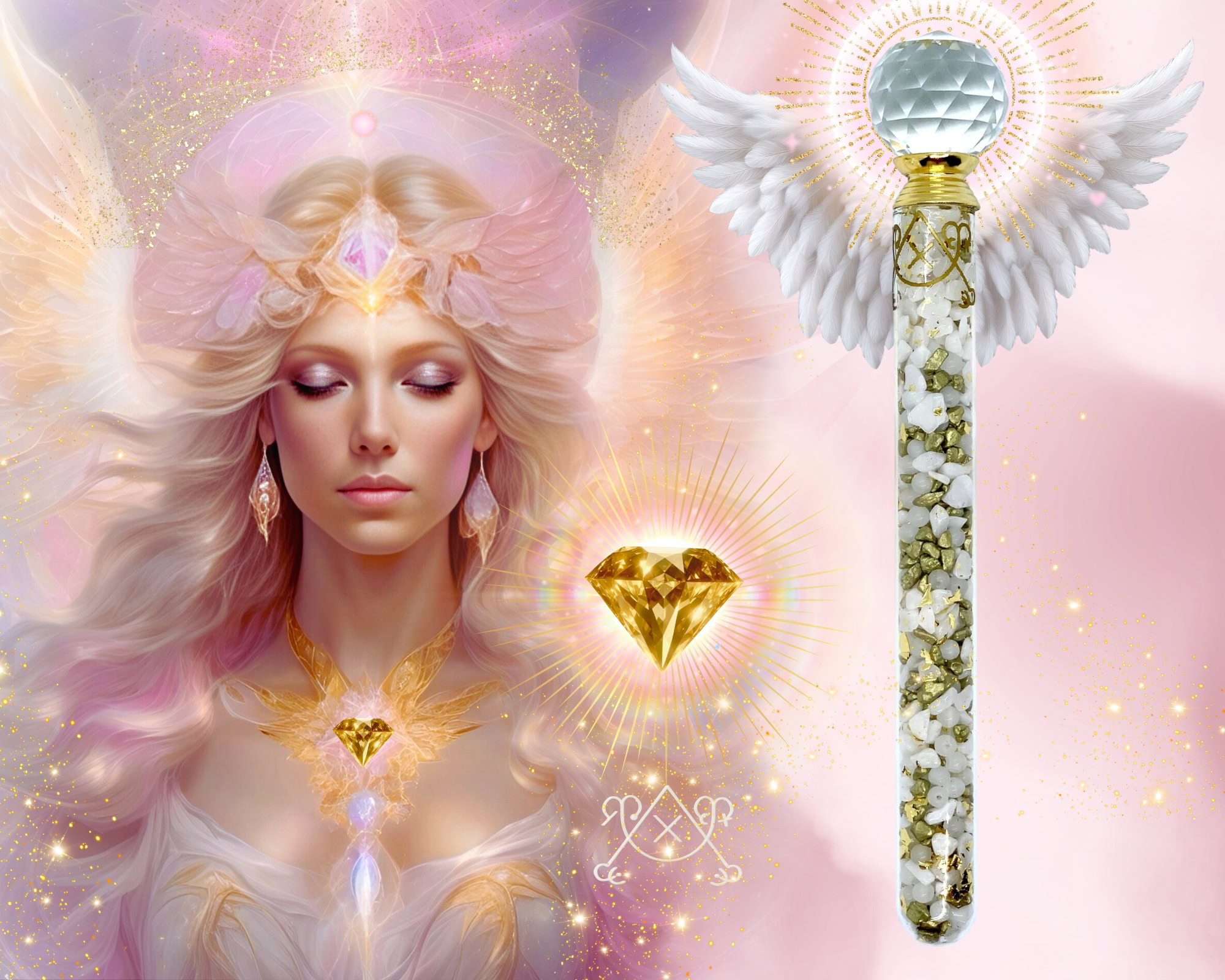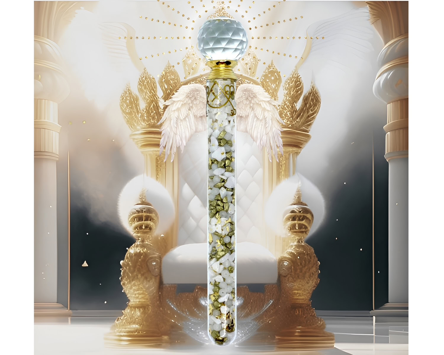 Reine Handarbeit: Labor-Glasstab, facettierte Prisma-Kristallkugel als Abschluss, vergoldeter Engel-Charm – jedes Detail in höchster Achtsamkeit gefertigt • Jeder Stab wird einzeln aufgeladen, geprüft und in höchster Liebesenergie verpackt.