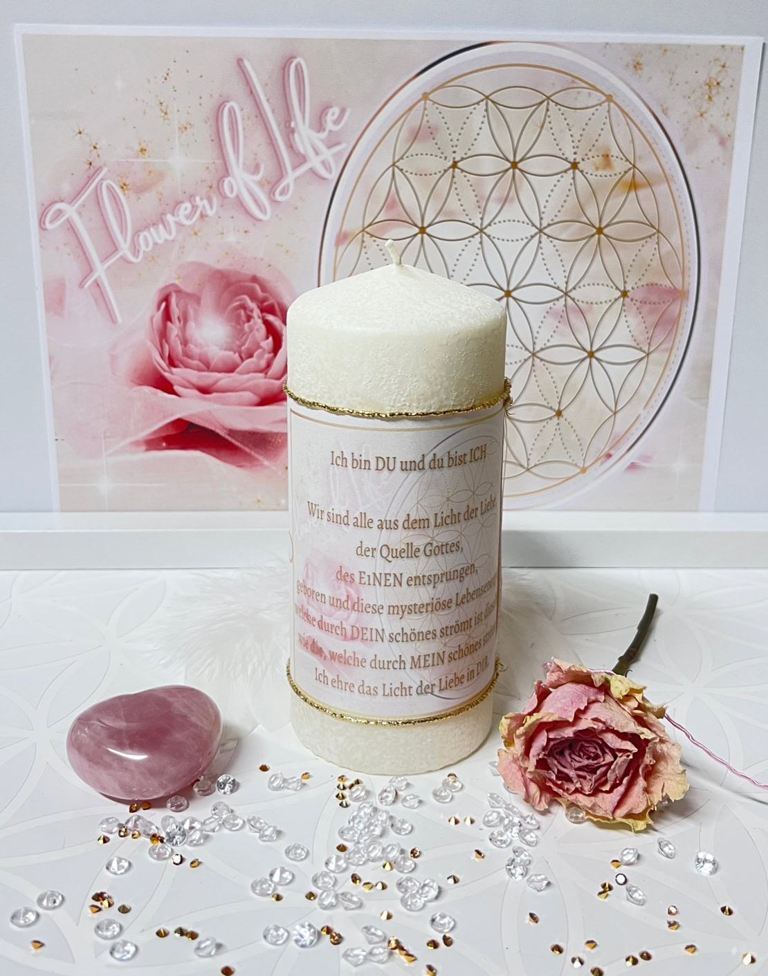 Geweihte Kerze „Verbinde Dich mit dem schützenden und universellen Licht „Flower of LIFE“- Herzenslicht (Rosa.Weiss.Gold)