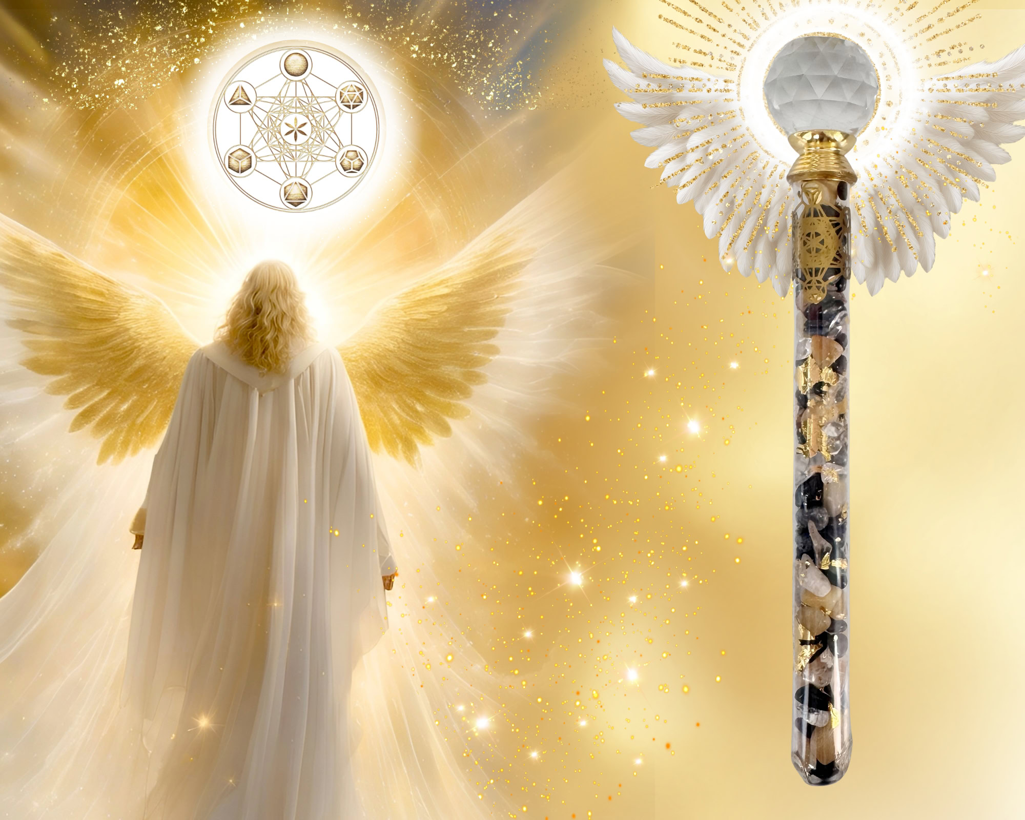 Programmiert mit dem heiligen Symbol Metatrons Würfel trägt der Stab die Urmatrix der Schöpfung in sich. Metatrons Würfel verbindet die fünf platonischen Körper, die die Elemente und Chakren repräsentieren, und erinnert dich daran, dass du Teil dieser kosmischen Ordnung bist.