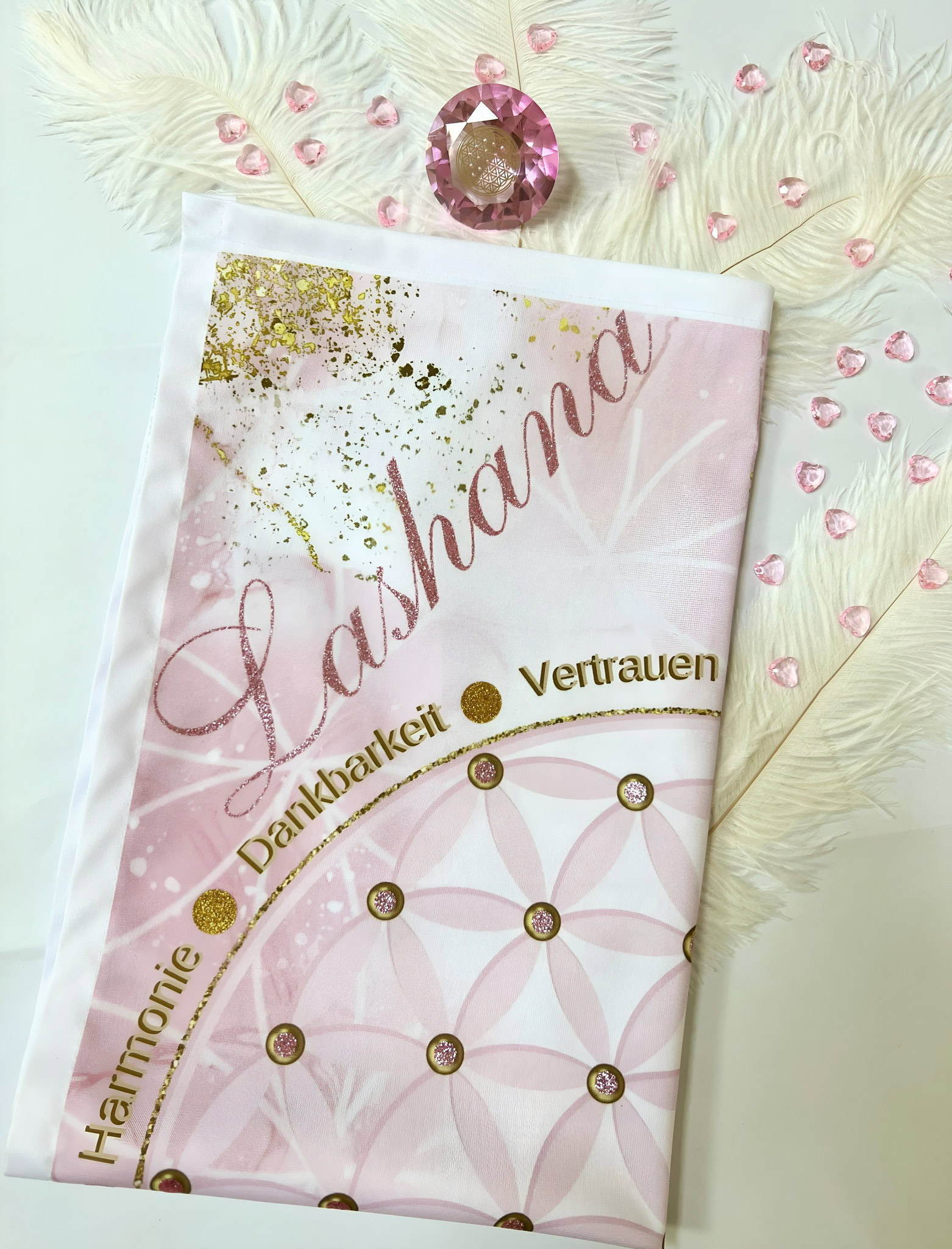 Das „Flower of Life“-Tuch mit deinem Seelennamen ist ein heiliges Feld, das dich direkt mit deiner Seele verbindet.