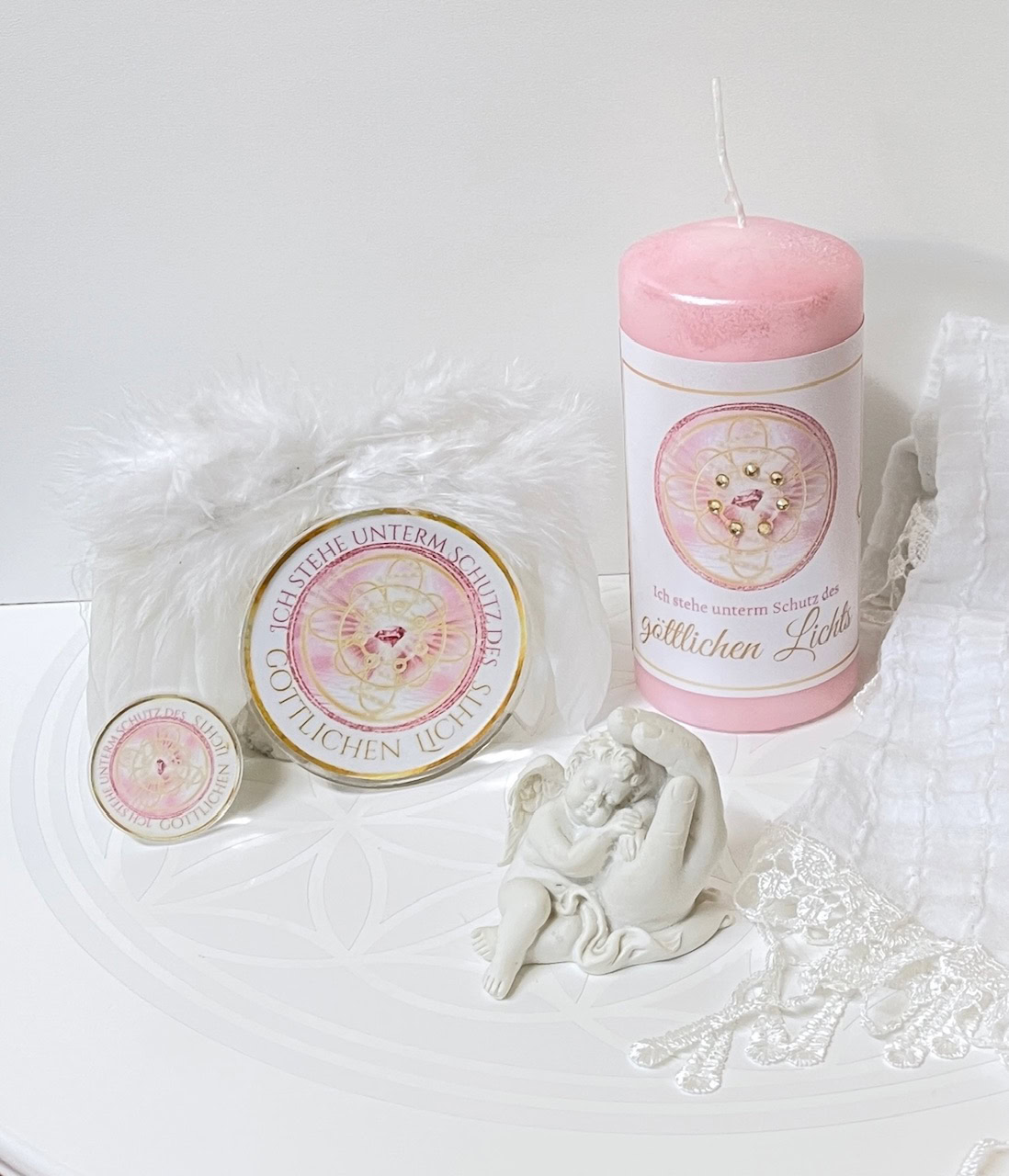 Die geweihte Kerze, der energetisierte Handschmeichler, der Untersetzer und der Meditationsschal sind Träger eines gechannelten Gebets, das in reiner Verbindung zur göttlichen Liebe empfangen wurde.