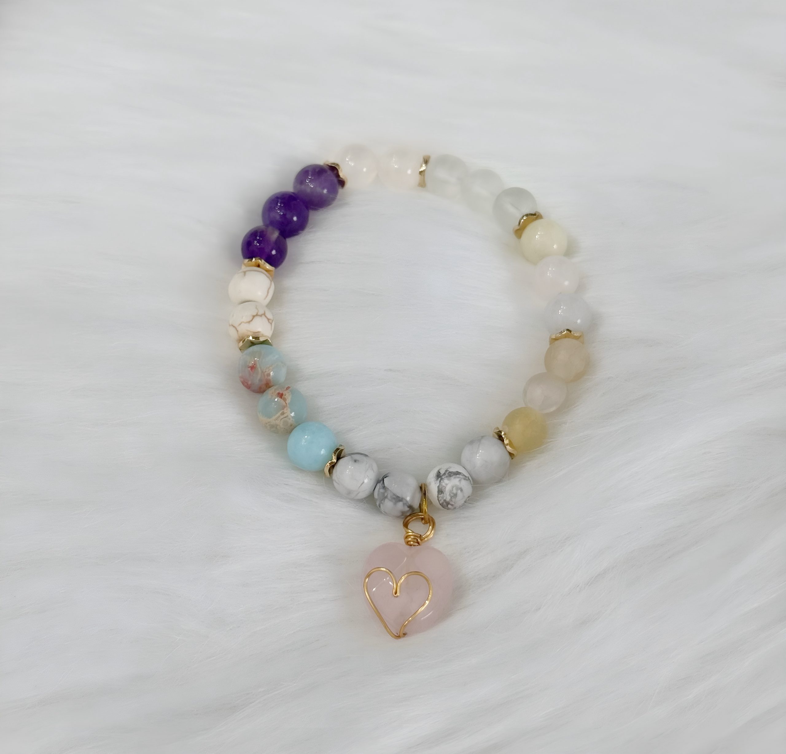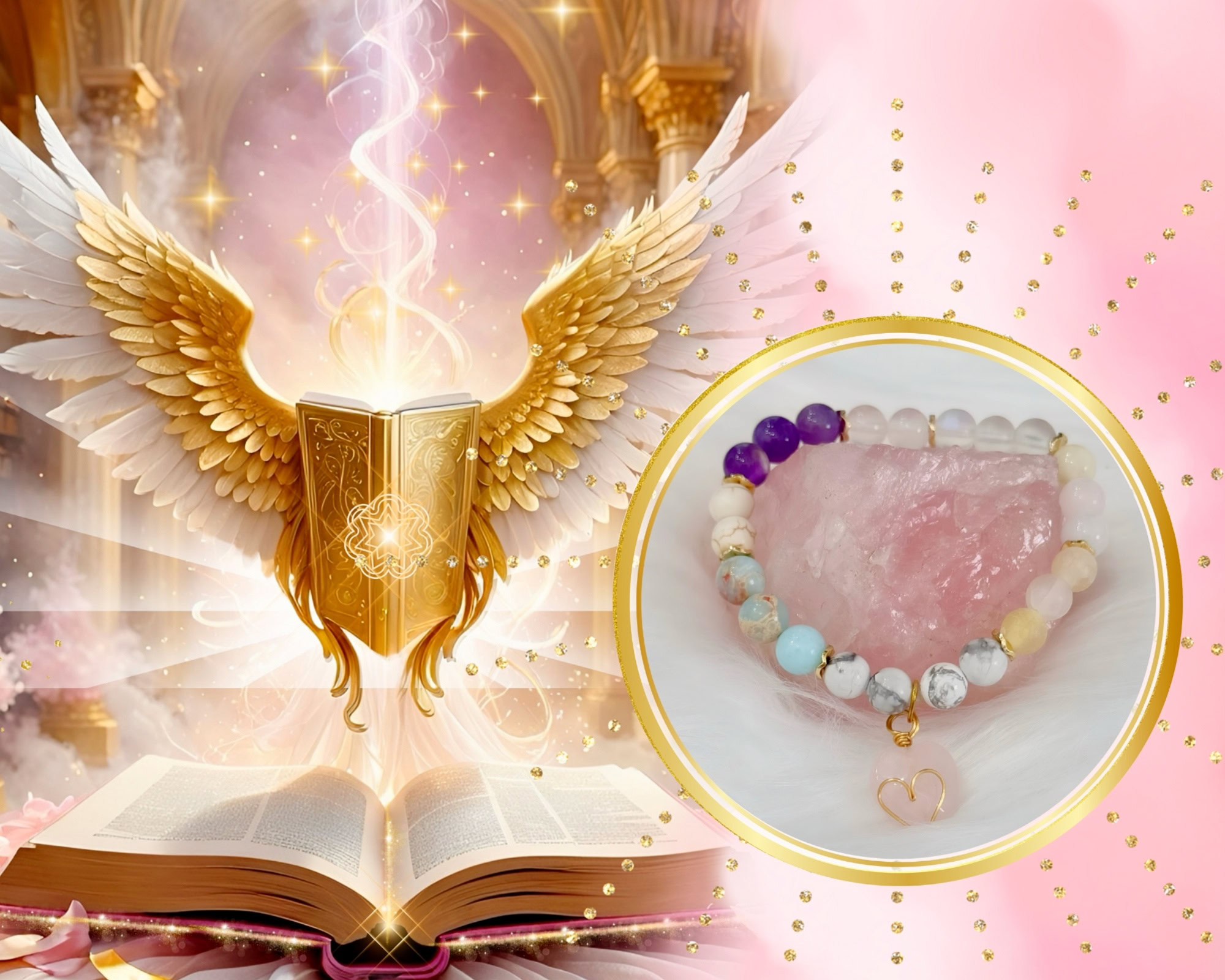 In der Mitte ruht das energetische Zentrum – ein hochschwingender Lichtstein Rosenquarz Herz , der die ganze Frequenz des Armbands bündelt.