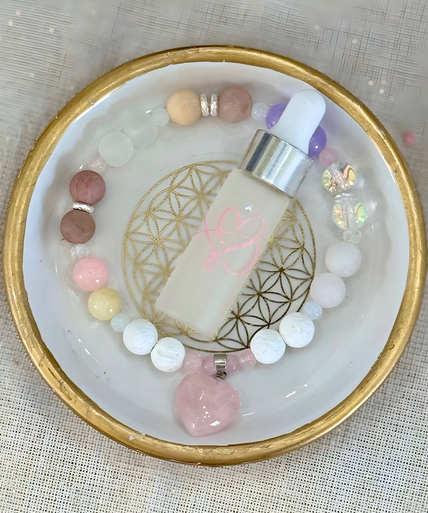 Lass die Schwingung von Rosenquarz, Edelsteinen und Öl wie einen Lichtmantel der Liebe durch dein Energiefeld strömen.