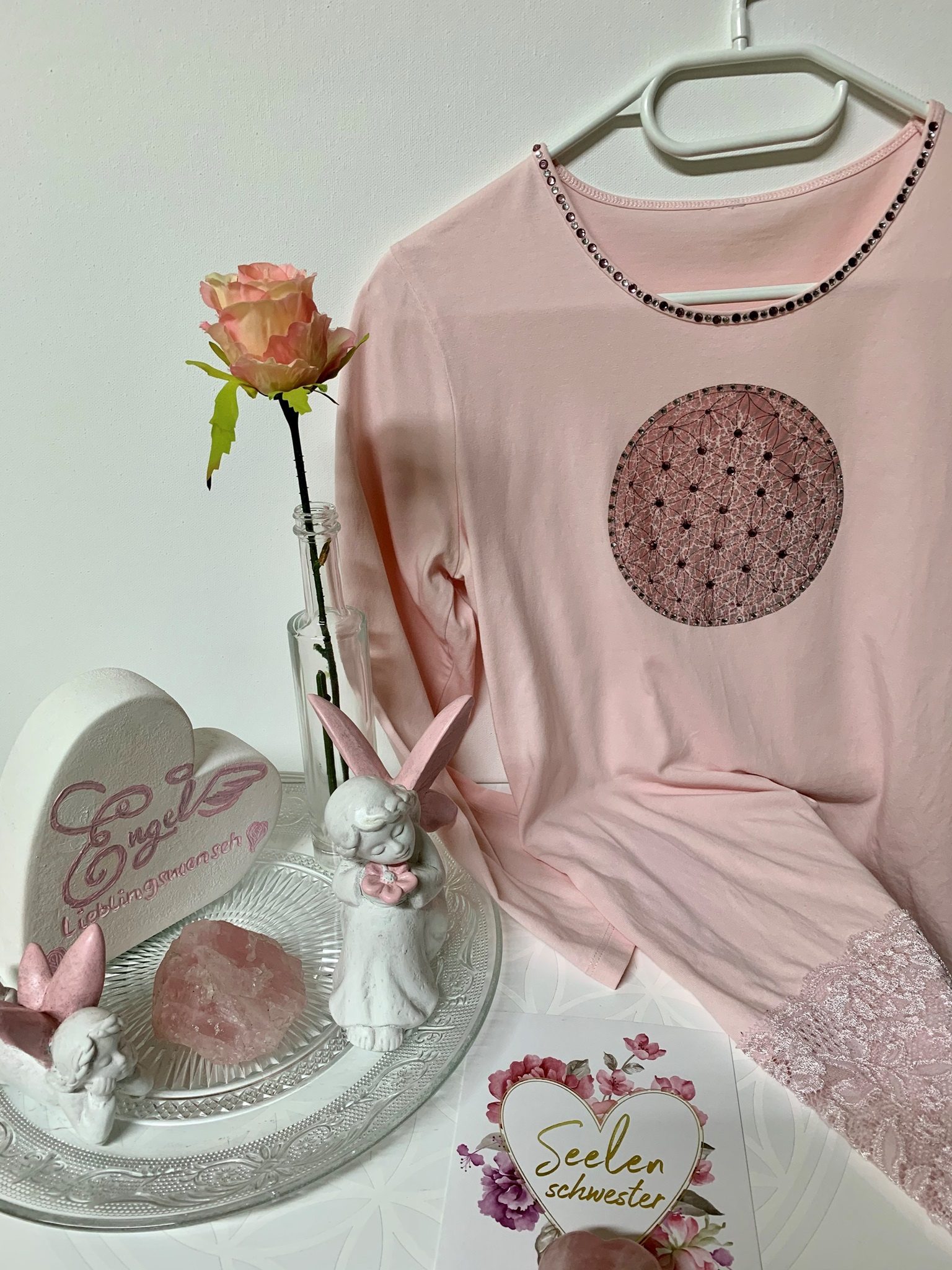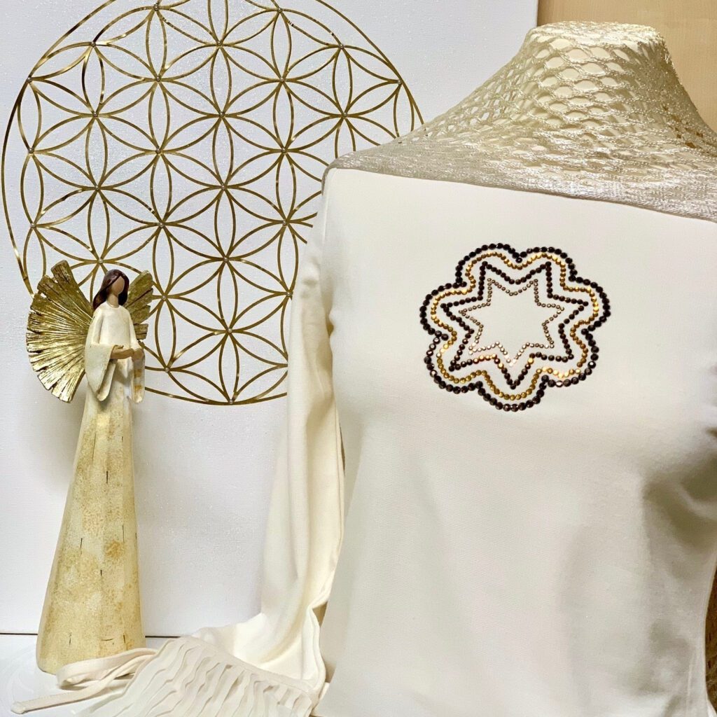 Da ich selbst sehr gerne Kleidung mit Strass-Applikationen trage, entstand in mir der Wunsch, diese Liebe mit der Energiearbeit zu verbinden – und so ein Kleidungsstück zu erschaffen, das nicht nur äußerlich schmückt, sondern dich innerlich stärkt.