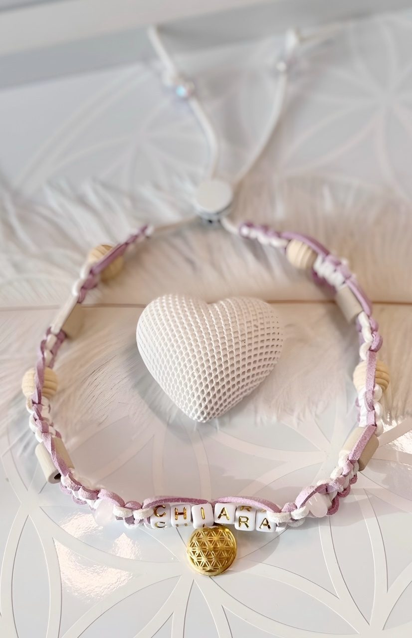Besonders kraftvoll: die liegende Acht (∞) im Namensbereich – Symbol für Unendlichkeit und Balance – verbunden mit einem goldenen Blume-des-Lebens-Charm direkt darunter.
