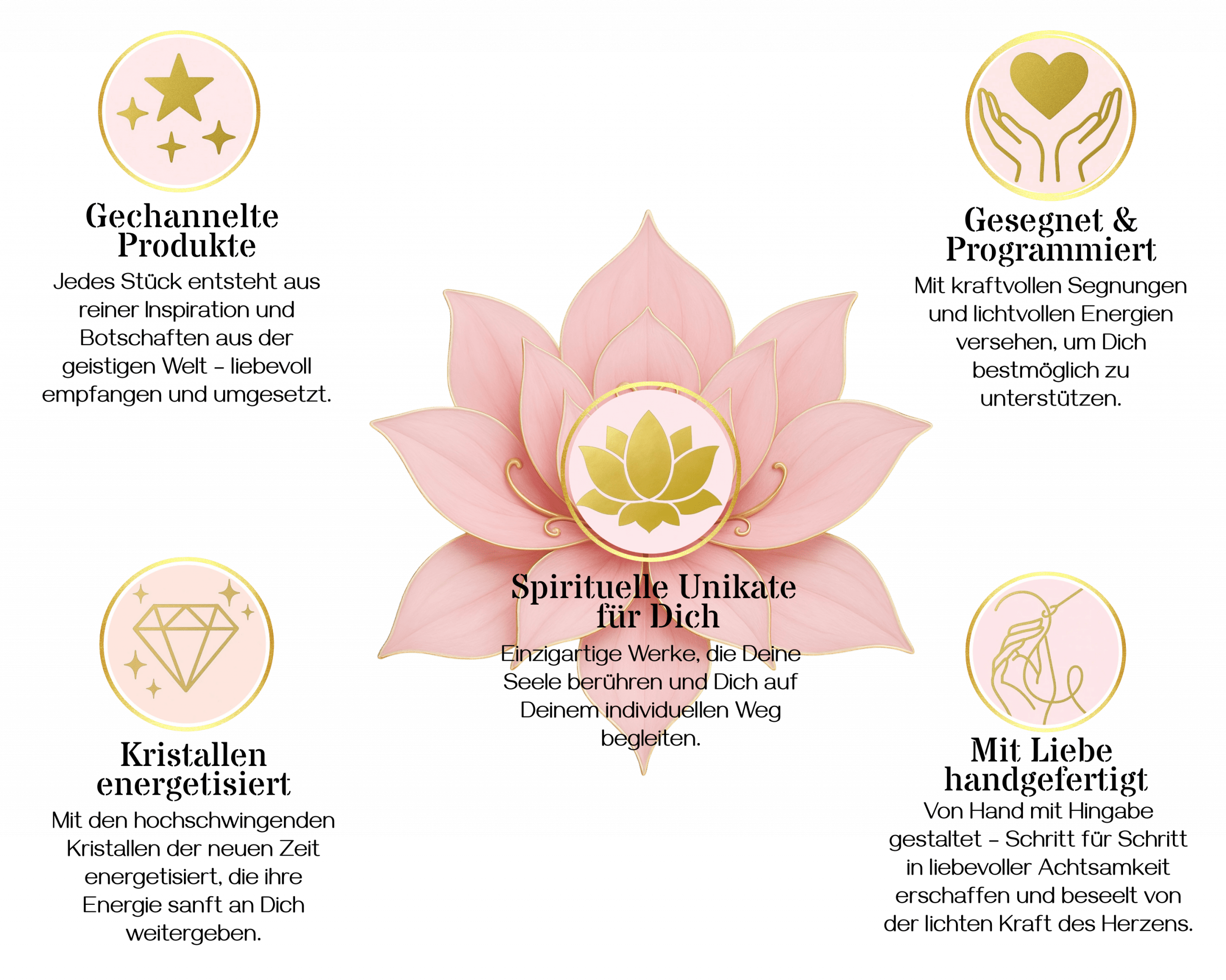 Jedes meiner lichtvollen Werkzeuge wird in achtsamer Handarbeit erschaffen – energetisiert, gesegnet und mit reiner Liebesschwingung gestaltet.