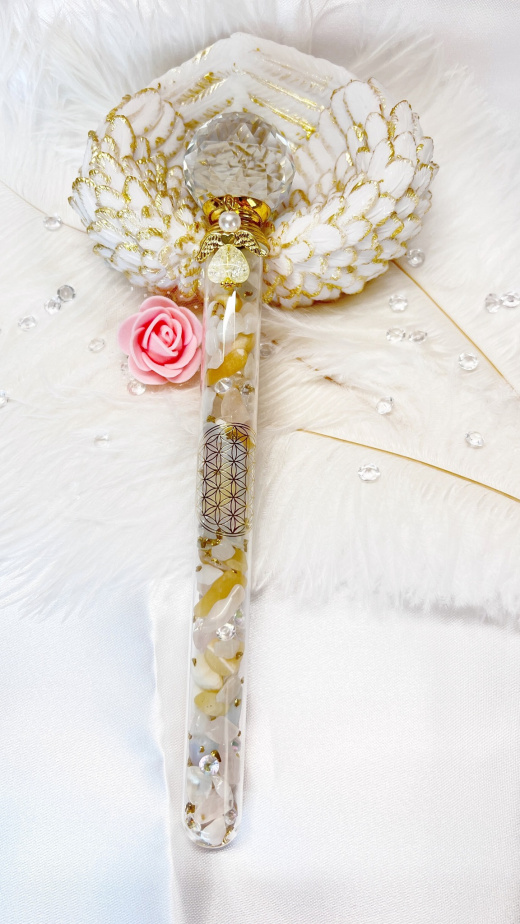 Dieser einzigartige Edelsteinstab wurde mit großer Sorgfalt und Liebe für Dich selbst kreiert, welches ihm dadurch eine starke und positive Ausstrahlung verleiht.